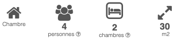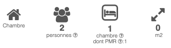 | Chambres | Chambre(s): 1 dont PMR (Personne à Mobilité Réduite): 1 Lit(s): 2 dont lit(s) 1 pers.: 2 dont lit(s) 2 pers.: 0 |